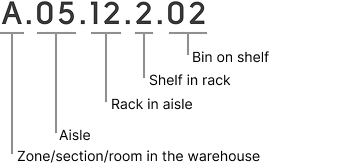 You can adjust the structure if your setup is different. If you don’t use zones or shelves, skip those levels. If you store items on the floor instead of in racks, you might use something like A.05.12 as your ground-level location.